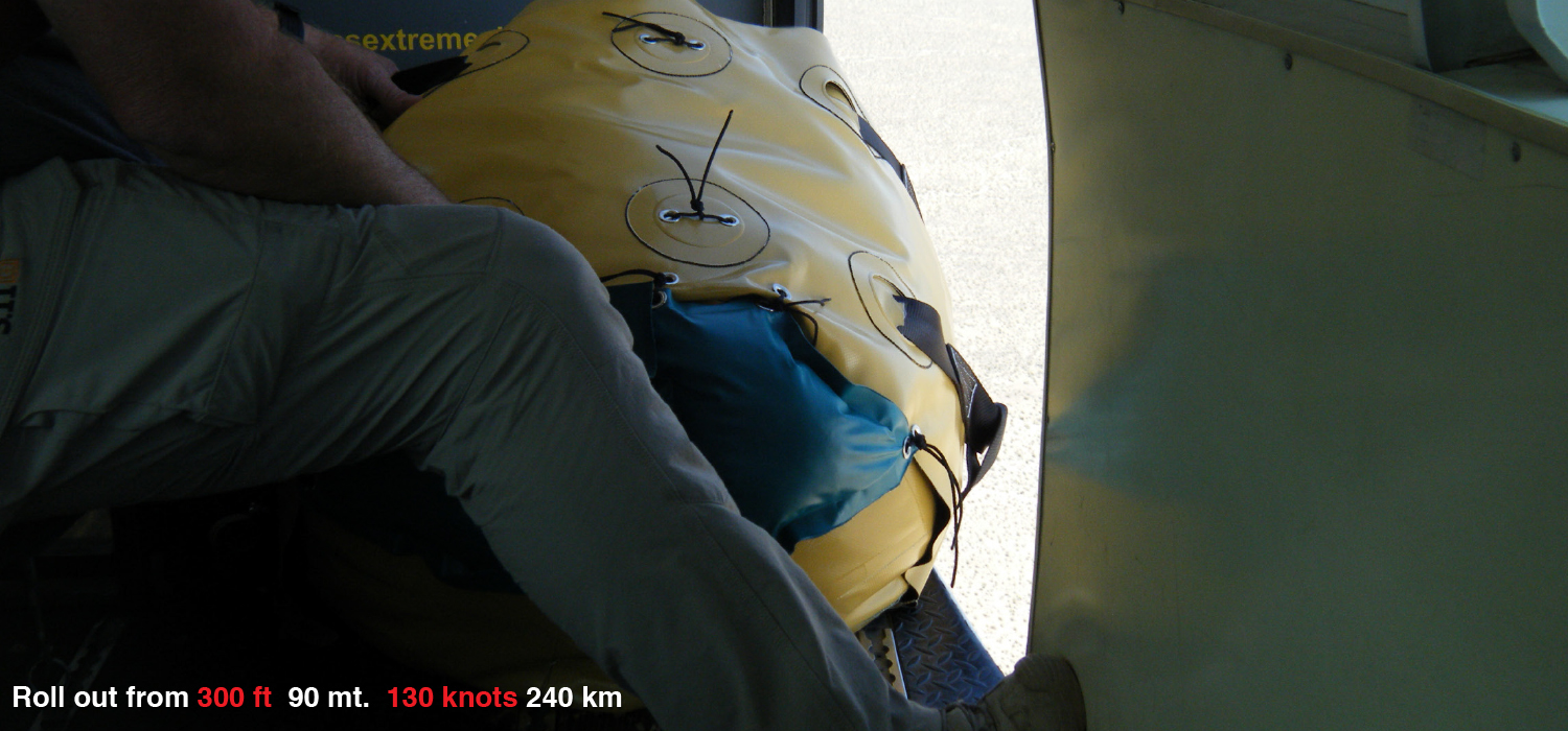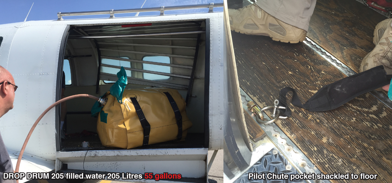 NO PARACHUTE drop success depends, on pilots skill and willingness to fly at 70 knots or slower – at 50 ft or lower. Must avoid concrete and rocky ground. Tank can bust! If not stay within operational limitations.