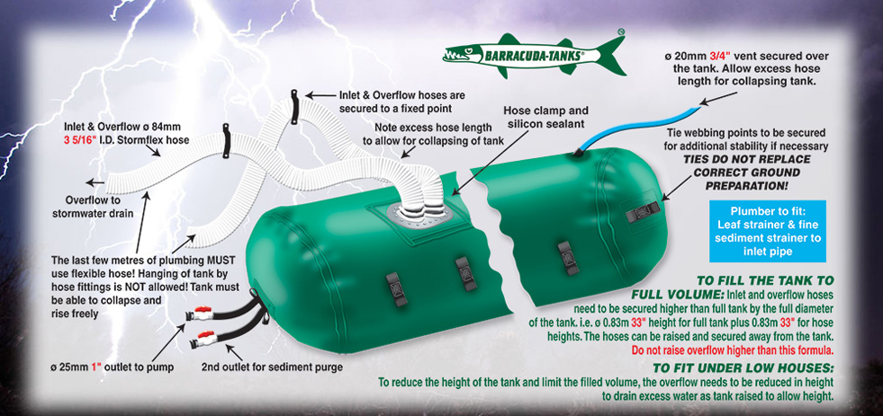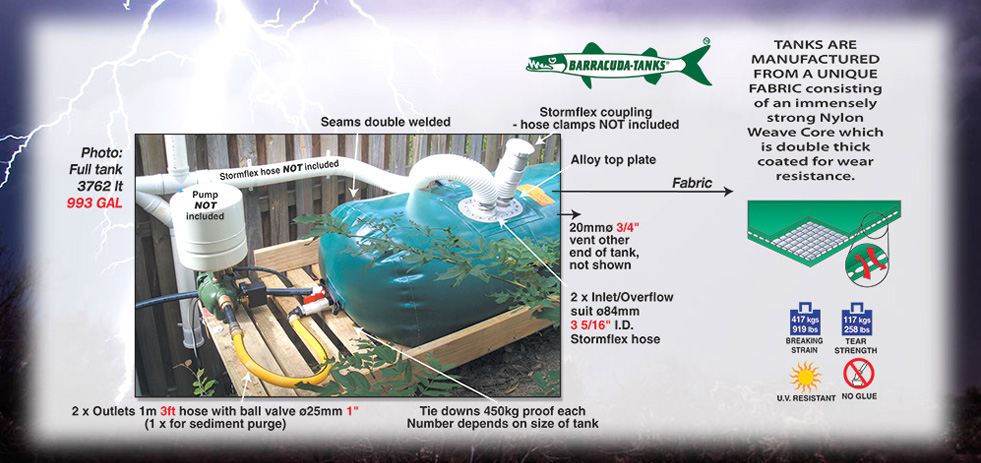 Barracuda Rainwater Collapsible Water Tanks keep your city home beautiful. The tough tanks fit hard to access out of sight places. Areas not usually used e.g. under pool ledges, bottom of steep hill, under the home etc. It can fit into impossible places.