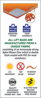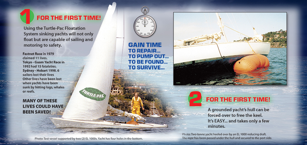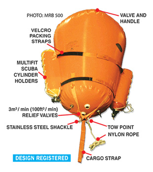 TOUGH COMPACT LIFT BAGS. Ideal for shallow depth lifts and surface floatation as they can be secured hard against the object to be supported or raised. The unique single tie point set up does not require a spreader bar and suits emergency uses such as yacht floatation or rescue tasks.ENCLOSED LIGHT LIFT BAGS from 250 kg 551 lbs to 1000 kg 2204 lbs. Ideal for shallow water lifts single tie point not need spreader bar. Used for yacht floatation system as well. Tough compact lift bags. Made by TURTLE-PAC in Australia.